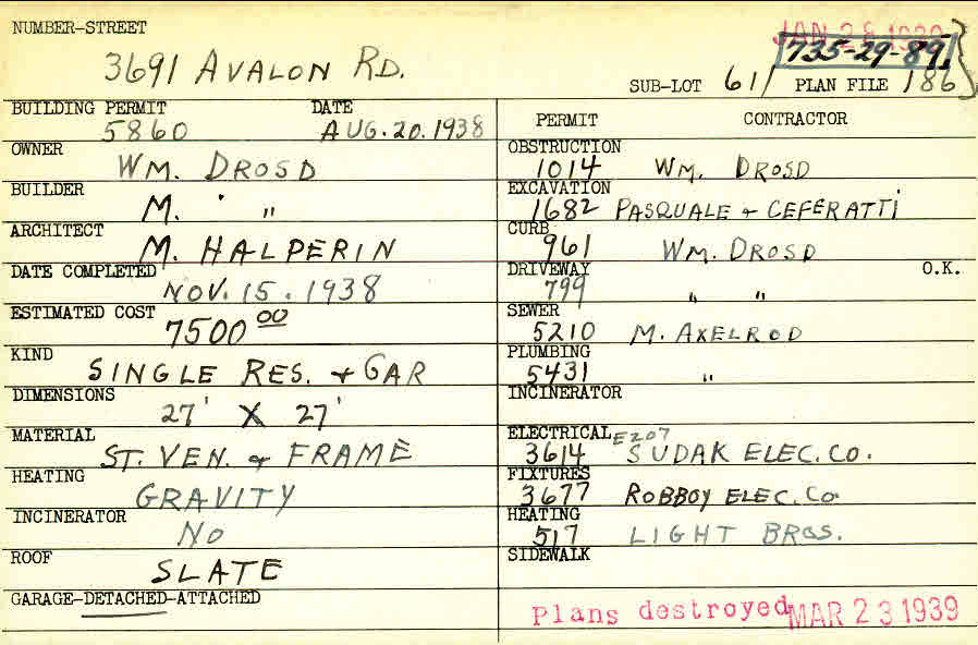 3691 Avalon Road Shaker Heights, OH 44120 PARCEL ID: 735-29-089 Building Permit Date: 08-20-1938 Plan File Number: 186 Owner: Drosd, William Builder: Drosd, M. Architect: Halperin, M. P. Estimated Cost: 7500 Date Completed: 11-15-1938 Kind: Single Dwelling and Garage Material: Stone Veneer and Frame Heating: Gravity System Roof: Slate Garage: detached |