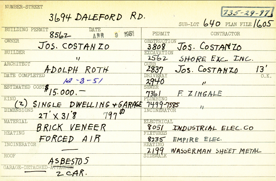 3694 Daleford Road Shaker Heights, OH 44120 PARCEL ID: 735-29-097 Building Permit Date: 04-09-1951 Plan File Number: 1605 scanned, 12171 Microfilm Roll: Roll025, NewRoll#11 Neighborhood: Lomond Owner: Constanzo, Joseph Builder: Constanzo, Joseph Architect: Roth, Adolph Estimated Cost: 15000 Date Completed: 12-03-1951 Kind: Single Dwelling and Garage (2) Material: Brick Veneer Heating: Forced Air Roof: Asbestos Garage: detached 2 car |