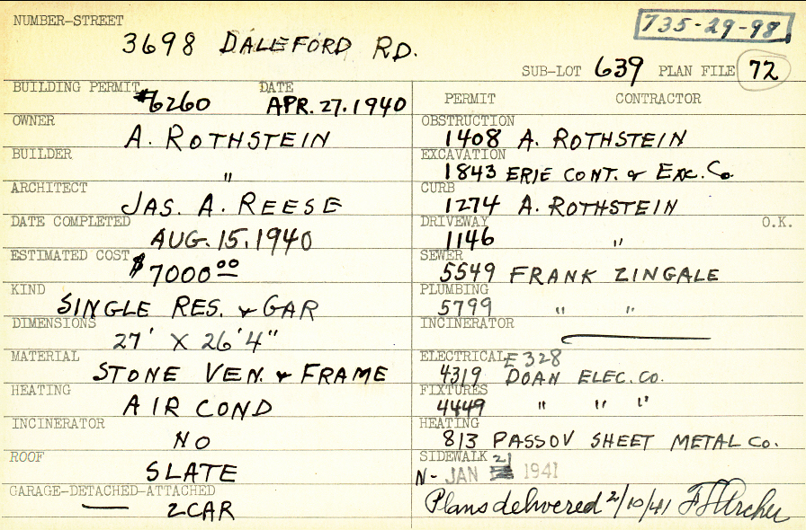 3698 Daleford Road Shaker Heights, OH 44120 PARCEL ID: 735-29-098 Building Permit Date: 04-27-1940 Plan File Number: 72 Neighborhood: Lomond Owner: Rothstein, A. Builder: Rothstein, A. Architect: Reese, James A. Estimated Cost: 7000 Date Completed: 08-15-1940 Kind: Single Dwelling and Garage Material: Stone Veneer and Frame Heating: Air Conditioned Roof: Slate Garage: detached 2 car |
