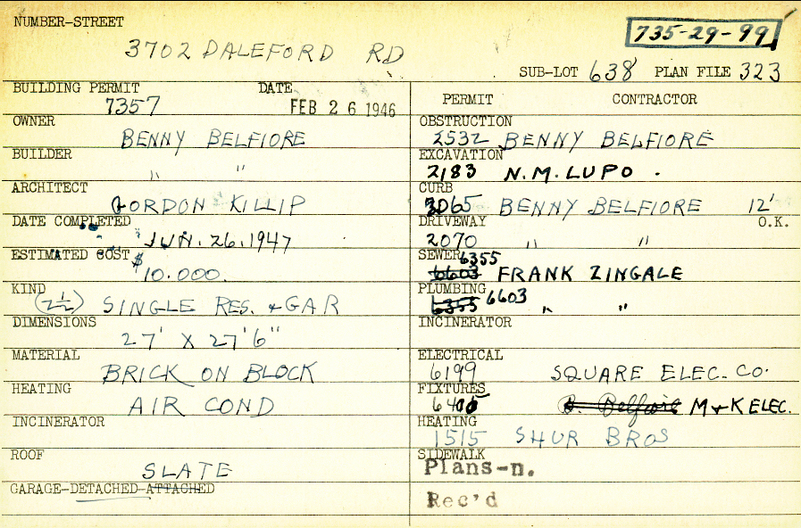 3702 Daleford Road Shaker Heights, OH 44120 PARCEL ID: 735-29-099 Building Permit Date: 02-26-1946 Plan File Number: 323 all scanned Microfilm Roll: Roll004 Neighborhood: Lomond Owner: Belfiore, Benny Builder: Belfiore, Benny Architect: Killip, Gordon Estimated Cost: 10000 Date Completed: 06-26-1947 Kind: Single Dwelling and Garage (2) Material: Brick on Block Heating: Air Conditioned Roof: Slate Garage: detached |