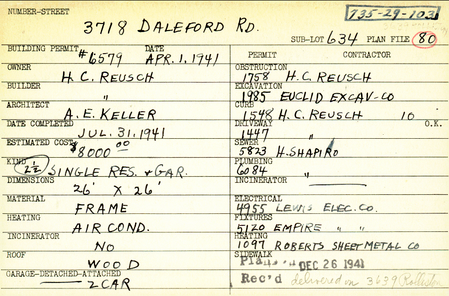 3718 Daleford Road Shaker Heights, OH 44120 PARCEL ID: 735-29-103 Building Permit Date: 01-01-1941 Plan File Number: 80 Neighborhood: Lomond Owner: Reusch, H. C. Builder: Reusch, H. C. Architect: Keller, Arthur Emil Estimated Cost: 8000 Date Completed: 07-31-1941 Kind: Single Dwelling and Garage (2) Material: Frame Heating: Air Conditioned Roof: Wood Garage: detached 2 car |
