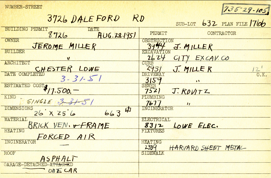 3726 Daleford Road Shaker Heights, OH 44120 PARCEL ID: 735-29-105 Building Permit Date: 08-28-1951 Plan File Number: 1766 scanned, 5693 Microfilm Roll: Roll26A, Roll#77 Neighborhood: Lomond Owner: Miller, Jerome Builder: Miller, Jerome Architect: Lowe, Chester Estimated Cost: 17500 Date Completed: 03-31-1951 Kind: Single, Single Residence or Dwelling Material: Brick Veneer and Frame Heating: Forced Air Roof: Asphalt Shingles Garage: detached |