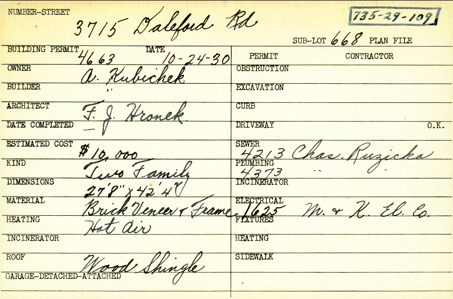 3715 Daleford Road Shaker Heights, OH 44120 PARCEL ID: 735-29-109 Building Permit Date: 10-24-1930 Plan File Number: 0 Neighborhood: Lomond Owner: Kubichek, A. Builder: Kubichek, A. Architect: Hronek, F. J Estimated Cost: 10000 Kind: Duplex or Two-Family Material: Brick Veneer and Frame Heating: Hot Air Roof: Wood Shingle |