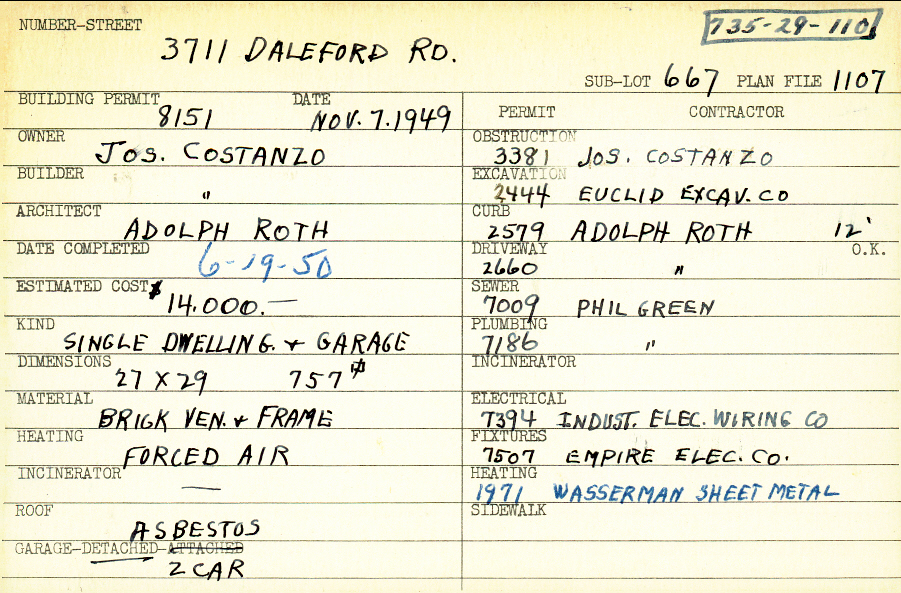 3711 Daleford Road Shaker Heights, OH 44120 PARCEL ID: 735-29-110 Building Permit Date: 11-07-1949 Plan File Number: 1107 all scanned Microfilm Roll: Roll013 Neighborhood: Lomond Owner: Costanzo, Joseph Builder: Costanzo, Joseph Architect: Roth, Adolph Estimated Cost: 14000 Date Completed: 06-19-1950 Kind: Single Dwelling and Garage Material: Brick Veneer and Frame Heating: Forced Air Roof: Asbestos Garage: detached 2 car |