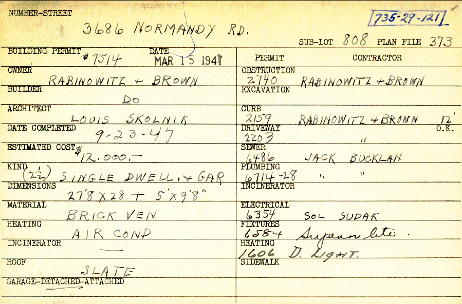 3686 Normandy Road Shaker Heights, OH 44120 PARCEL ID: 735-29-121 Building Permit Date: 03-15-1947 Plan File Number: 373 scanned, 7515 Microfilm Roll: Roll004, Roll#93 Neighborhood: Lomond Owner: Rabinowitz and Brown Builder: Rabinowitz and Brown Architect: Skolnik, Louis Estimated Cost: 12000 Date Completed: 09-23-1947 Kind: Single 2-1/2 Material: Brick Veneer Heating: Air Conditioned Roof: Slate Garage: detached |