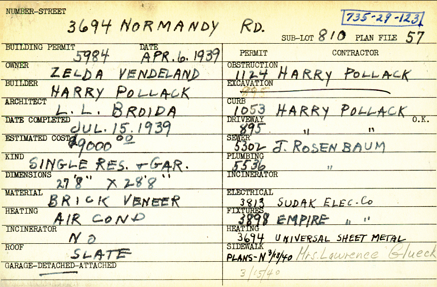 3694 Normandy Road Shaker Heights, OH 44120 PARCEL ID: 735-29-123 Building Permit Date: 04-06-1939 Plan File Number: 57 Neighborhood: Lomond Owner: Vendeland, Zelda Builder: Pollack, Harry Architect: Broida, L. L. Estimated Cost: 9000 Date Completed: 07-15-1939 Kind: Single Dwelling and Garage Material: Brick Veneer Heating: Air Conditioned Roof: Slate Garage: detached |