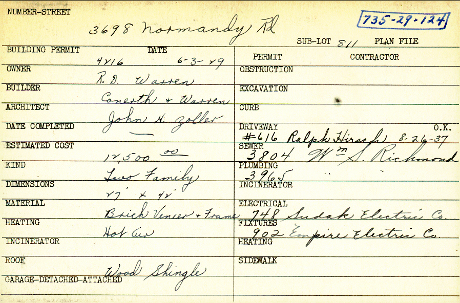 3698 Normandy Road Shaker Heights, OH 44120 PARCEL ID: 735-29-124 Building Permit Date: 06-03-1929 Plan File Number: 0 Neighborhood: Lomond Owner: Warren, R. D. Builder: Conerth and Warren Architect: Zoller, John H. Estimated Cost: 12500 Kind: Duplex or Two-Family Material: Brick Veneer and Frame Heating: Hot Air Roof: Wood Shingle Card Available: yes |