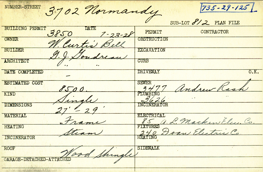 3702 Normandy Road Shaker Heights, OH 44120 PARCEL ID: 735-29-125 Building Permit Date: 07-23-1928 Plan File Number: 0 Neighborhood: Lomond Owner: Bell, W. Curtis Builder: Goudreau, G. J. Architect: Goudreau, G. J. Estimated Cost: 8500 Kind: Single, Single Residence or Dwelling Material: Frame Heating: Steam Roof: Wood Shingle Card Available: yes |
