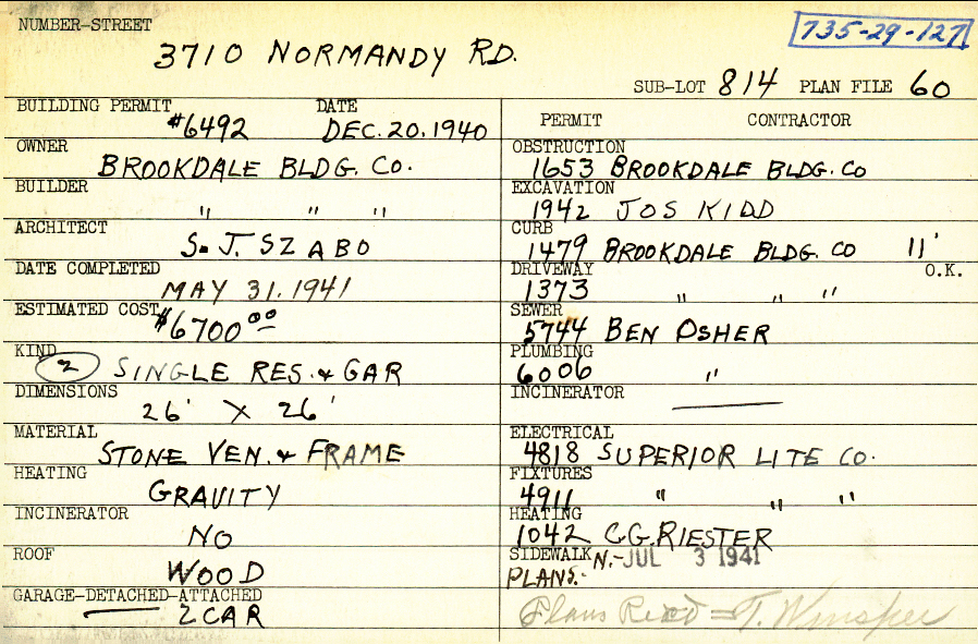 3710 Normandy Road Shaker Heights, OH 44120 PARCEL ID: 735-29-127 Building Permit Date: 12-20-1940 Plan File Number: 60, 10135 Microfilm Roll: NewRoll#2 Neighborhood: Lomond Owner: Brookdale Building Company Builder: Brookdale Building Company Architect: Szabo, S. J. Estimated Cost: 6700 Date Completed: 05-31-1941 Kind: Single Dwelling and Garage (2) Material: Stone Veneer and Frame Heating: Gravity System Roof: Wood Garage: detached 2 car |