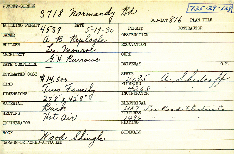 3718 Normandy Road Shaker Heights, OH 44120 PARCEL ID: 735-29-129 Building Permit Date: 05-19-1930 Plan File Number: 0 Neighborhood: Lomond Owner: Replogle, A. B. Builder: Monroe, Leonard Architect: Burrows, G. H. Estimated Cost: 14500 Kind: Duplex or Two-Family Material: Brick Heating: Hot Air Roof: Wood Shingle |