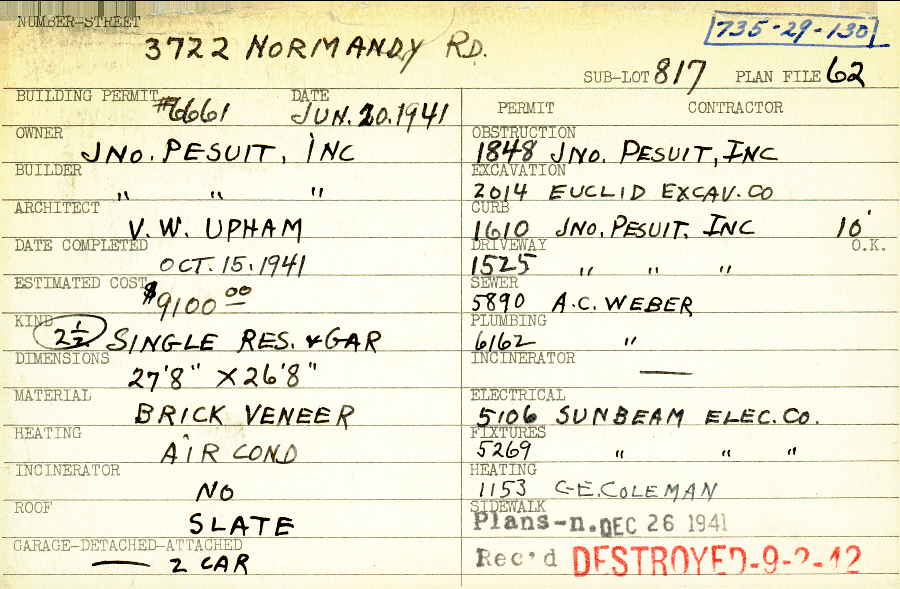 3722 Normandy Road Shaker Heights, OH 44120 PARCEL ID: 735-29-130 Building Permit Date: 06-20-1941 Plan File Number: 62 Neighborhood: Lomond Owner: John Pesuit, Inc Builder: John Pesuit, Inc Architect: Upham, V. W. Estimated Cost: 9100 Date Completed: 10-15-1941 Kind: Single 2-1/2 Material: Brick Veneer Heating: Air Conditioned Roof: Slate Garage: detached 2 car Card Available: yes |
