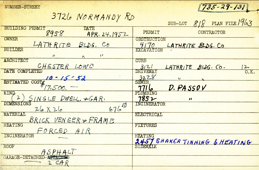 3726 Normandy Road Shaker Heights, OH 44120 PARCEL ID: 735-29-131 Building Permit Date: 04-24-1952 Plan File Number: 1963 all scanned Microfilm Roll: Roll029 Neighborhood: Lomond Owner: Lathrite Building Company Builder: Lathrite Building Company Architect: Lowe, Chester Estimated Cost: 17500 Date Completed: 10-15-1952 Kind: Single Dwelling and Garage (2) Material: Brick Veneer and Frame Heating: Forced Air Roof: Asphalt Garage: detached 2 car |