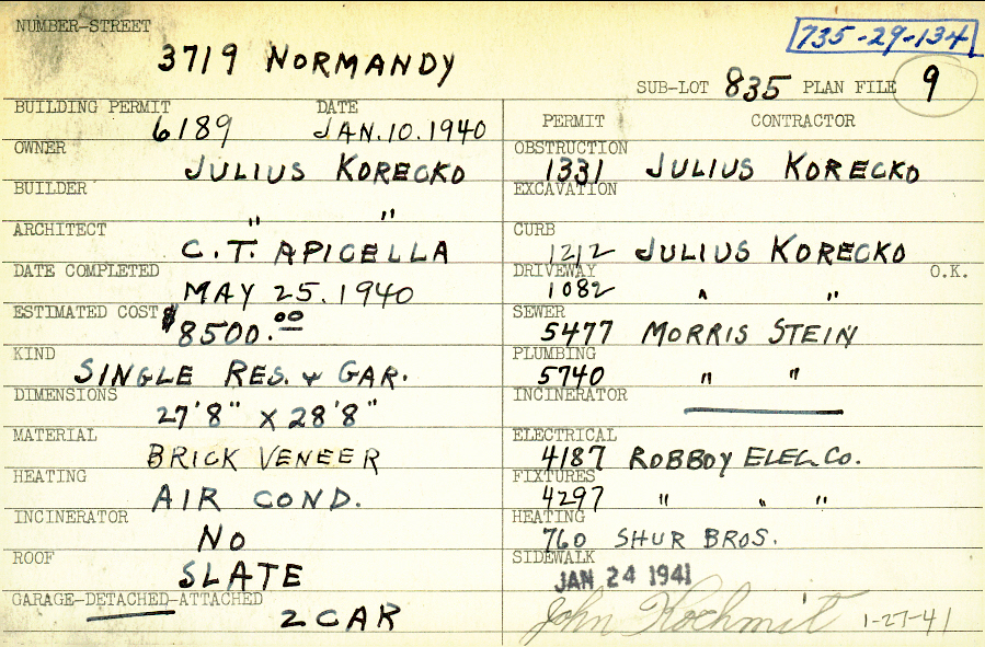 3719 Normandy Road Shaker Heights, OH 44120 PARCEL ID: 735-29-134 Building Permit Date: 01-10-1940 Plan File Number: 9 Neighborhood: Lomond Owner: Korecko, Julius Builder: Korecko, Julius Architect: Apicella, C. T. Estimated Cost: 8500 Date Completed: 05-25-1940 Kind: Single Dwelling and Garage Material: Brick Veneer Heating: Air Conditioned Roof: Slate Garage: detached 2 car Card Available: yes |