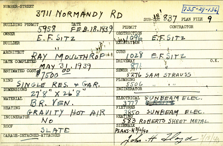 3711 Normandy Road Shaker Heights, OH 44120 PARCEL ID: 735-29-136 Building Permit Date: 02-18-1939 Plan File Number: 691 all scanned Microfilm Roll: Roll008 Neighborhood: Lomond Owner: Sitz, E. F. Builder: Sitz, E. F. Architect: Moulthrop, Ray Estimated Cost: 7500 Date Completed: 05-31-1939 Kind: Single Dwelling and Garage Material: Brick Veneer Heating: Hot Air Roof: Slate Garage: detached Blueprints: online, see link above |