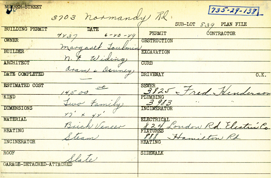 3703 Normandy Road Shaker Heights, OH 44120 PARCEL ID: 735-29-138 Building Permit Date: 06-20-1929 Plan File Number: 5425, 7293 Microfilm Roll: Roll#73, Roll#92 Neighborhood: Lomond Owner: Toulmin, Margaret Builder: Widing, N. F. Architect: Oram and Devney Estimated Cost: 14500 Kind: Duplex or Two-Family Material: Brick Veneer Heating: Steam Roof: Slate |