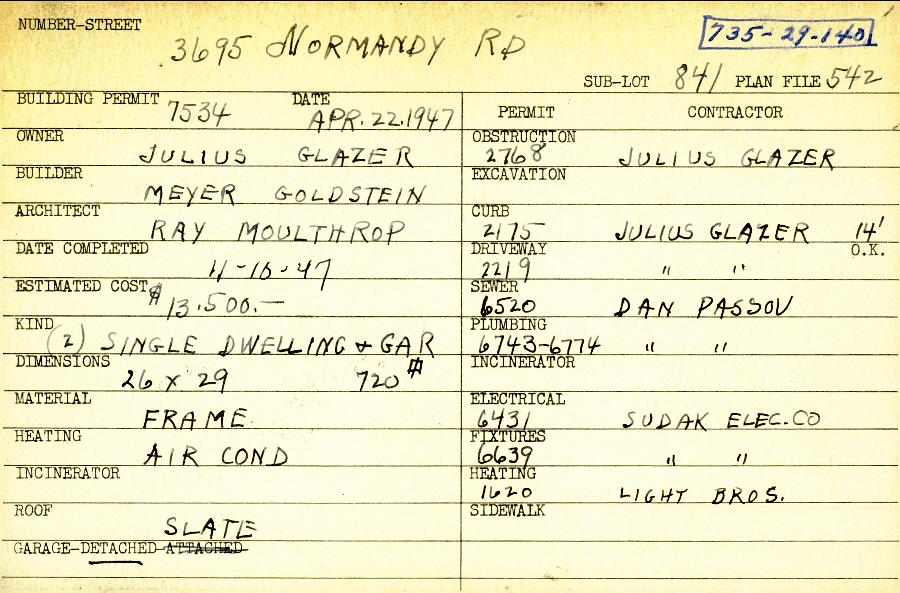 3695 Normandy Road Shaker Heights, OH 44120 PARCEL ID: 735-29-140 Building Permit Date: 04-22-1947 Plan File Number: 542 all scanned Microfilm Roll: Roll007 Neighborhood: Lomond Owner: Glazer, Julius Builder: Goldstein, Meyer Architect: Moulthrop, Ray Estimated Cost: 13500 Date Completed: 11-10-1947 Kind: Single Dwelling and Garage (2) Material: Frame Heating: Air Conditioned Roof: Slate Garage: detached |
