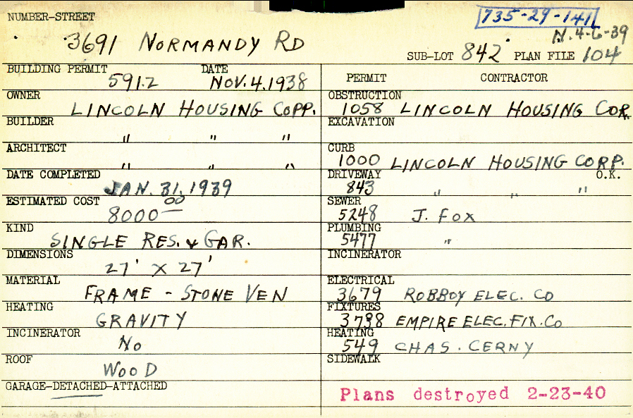 3691 Normandy Road Shaker Heights, OH 44120 PARCEL ID: 735-29-141 Building Permit Date: 11-04-1938 Plan File Number: 104 Neighborhood: Lomond Owner: Lincoln Housing Corporation Builder: Lincoln Housing Corporation Architect: Lincoln Housing Corporation Estimated Cost: 8000 Date Completed: 01-31-1939 Kind: Single Dwelling and Garage Material: Frame and Stone Veneer Heating: Gravity System Roof: Wood Garage: detached Card Available: yes |