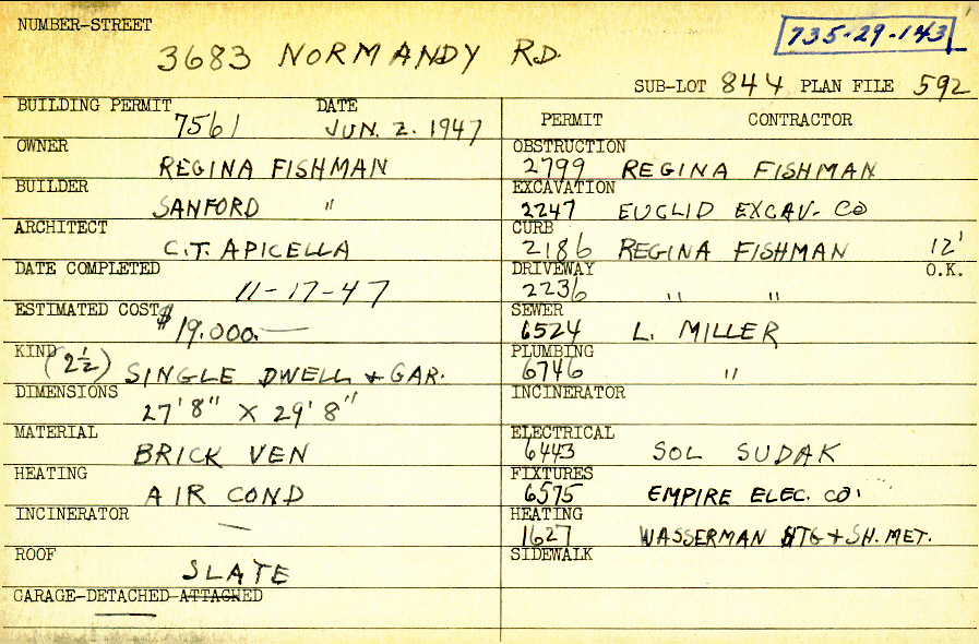 3683 Normandy Road Shaker Heights, OH 44120 PARCEL ID: 735-29-143 Building Permit Date: 06-02-1947 Plan File Number: 592 all scanned Microfilm Roll: Roll007 Neighborhood: Lomond Owner: Fishman, Regina Builder: Fishman, Sanford Architect: Apicella, C. T. Estimated Cost: 19000 Date Completed: 11-17-1947 Kind: Single 2-1/2 Material: Brick Veneer Heating: Air Conditioned Roof: Slate Garage: detached |