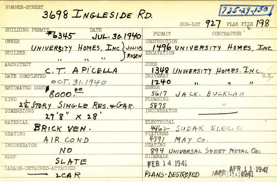 3698 Ingleside Road Shaker Heights, OH 44122 PARCEL ID: 735-29-150 Building Permit Date: 07-30-1940 Plan File Number: 198 Neighborhood: Lomond Owner: University Homes, Inc., Julius Rosen Builder: University Homes, Inc., Julius Rosen Architect: Apicella, C. T. Estimated Cost: 8000 Date Completed: 10-31-1940 Kind: Single 2-1/2 Material: Brick Veneer Heating: Air Conditioned Roof: Slate Garage: detached 2 car |
