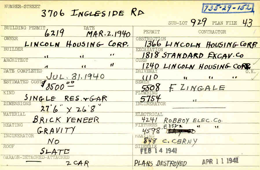 3706 Ingleside Road Shaker Heights, OH 44122 PARCEL ID: 735-29-152 Building Permit Date: 03-02-1940 Plan File Number: 43 Neighborhood: Lomond Owner: Lincoln Housing Corporation Builder: Lincoln Housing Corporation Architect: Lincoln Housing Corporation Estimated Cost: 8500 Date Completed: 07-31-1940 Kind: Single Dwelling and Garage Material: Brick Veneer Heating: Gravity System Roof: Slate Garage: detached 2 car Card Available: yes |
