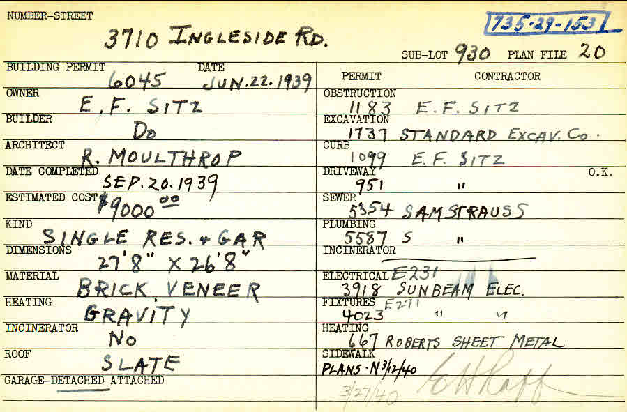 3710 Ingleside Road Shaker Heights, OH 44122 PARCEL ID: 735-29-153 Building Permit Date: 06-22-1939 Plan File Number: 20 Neighborhood: Lomond Owner: Sitz, E. F. Builder: Sitz, E. F. Architect: Moulthrop, R. Estimated Cost: 9000 Date Completed: 09-20-1939 Kind: Single Dwelling and Garage Material: Brick Veneer Heating: Gravity System Roof: Slate Garage: detached |