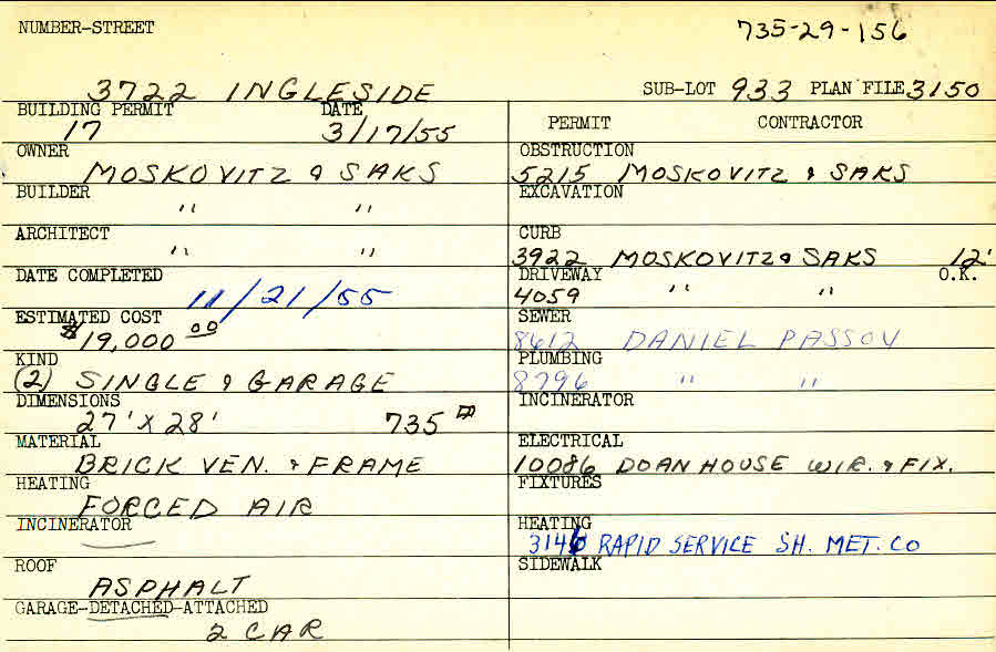 3722 Ingleside Road Shaker Heights, OH 44122 PARCEL ID: 735-29-156 Building Permit Date: 03-17-1955 Plan File Number: 3150 Microfilm Roll: Roll#44 Neighborhood: Lomond Owner: Moskovitz and Saks Builder: Moskovitz and Saks Architect: Moskovitz and Saks Estimated Cost: 19000 Date Completed: 11-21-1955 Kind: Single Dwelling and Garage (2) Material: Brick Veneer and Frame Heating: Forced Air Roof: Asphalt Garage: detached 2 car |