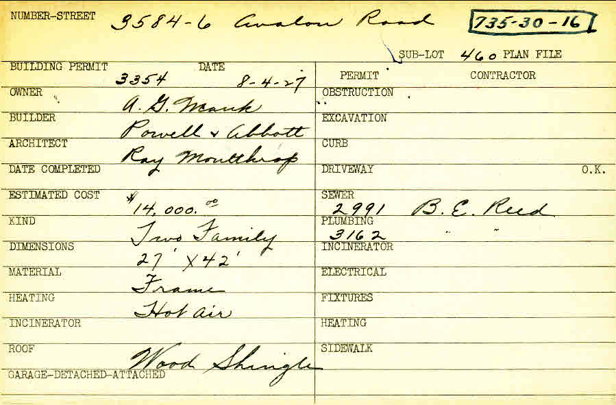 3584 Avalon Road Shaker Heights, OH 44120 PARCEL ID: 735-30-016 Building Permit Date: 08-04-1927 Plan File Number: 220 scanned, 3428, 6910 Microfilm Roll: Roll002, Roll#50, Roll#90 Neighborhood: Lomond Owner: Mauk, A. G. Builder: Powell and Abbott Architect: Moulthrop, Ray Estimated Cost: 14000 Kind: Duplex or Two-Family Material: Frame Heating: Hot Air Roof: Wood Shingle |