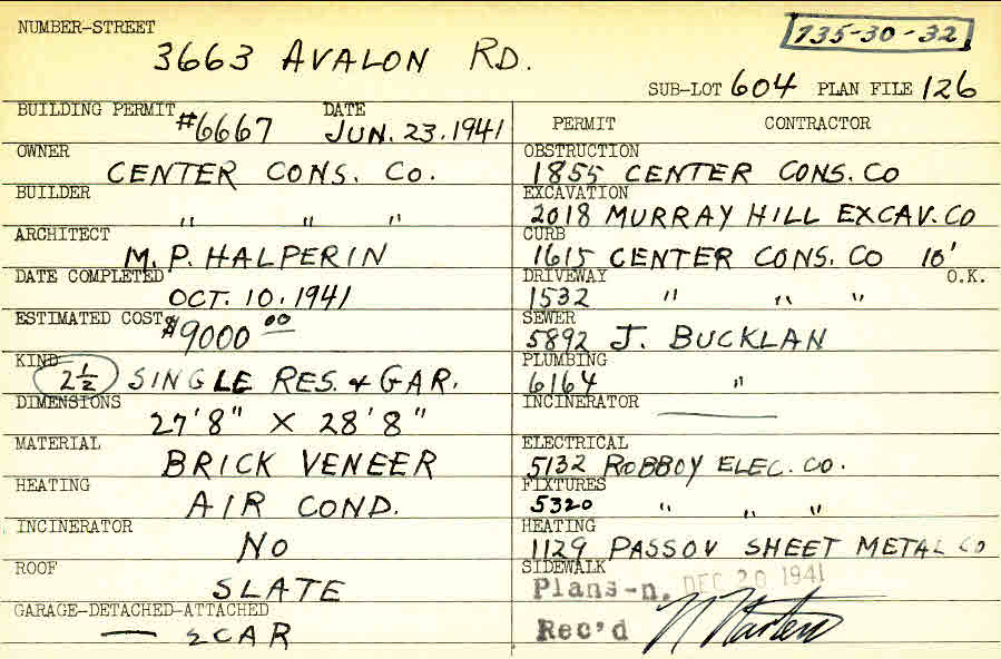 3663 Avalon Road Shaker Heights, OH 44120 PARCEL ID: 735-30-032 Building Permit Date: 06-23-1941 Plan File Number: 126 Neighborhood: Lomond Owner: Center Construction Company Builder: Center Construction Company Architect: Halperin, M. P. Estimated Cost: 9000 Date Completed: 10-10-1941 Kind: Single Dwelling and Garage (2) Material: Brick Veneer Heating: Air Conditioned Roof: Slate Garage: detached 2 car |