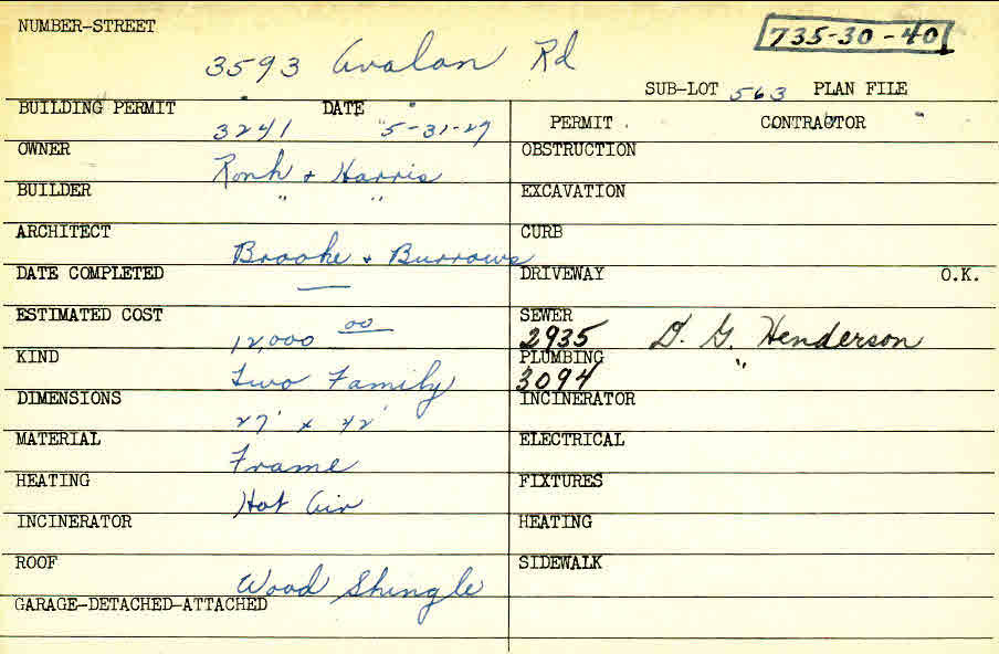 3593 Avalon Road Shaker Heights, OH 44120 PARCEL ID: 735-30-040 Building Permit Date: 05-31-1927 Plan File Number: 0 Neighborhood: Lomond Owner: Ronh and Harris Builder: Ronh and Harris Architect: Brooke and Burrows Estimated Cost: 12000 Kind: Duplex or Two-Family Material: Frame Heating: Hot Air Roof: Wood Shingle |