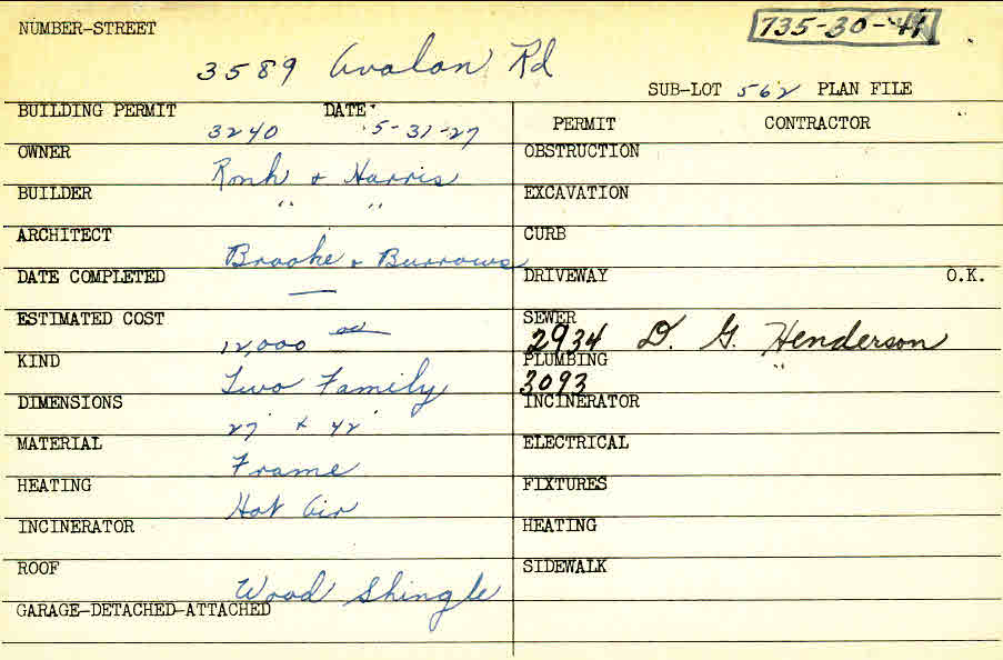 3589 Avalon Road Shaker Heights, OH 44120 PARCEL ID: 735-30-041 Building Permit Date: 05-31-1927 Plan File Number: 0 Neighborhood: Lomond Owner: Ronh and Harris Builder: Ronh and Harris Architect: Brooke and Burrows Estimated Cost: 12000 Kind: Duplex or Two-Family Material: Frame Heating: Hot Air Roof: Wood Shingle Card Available: yes |