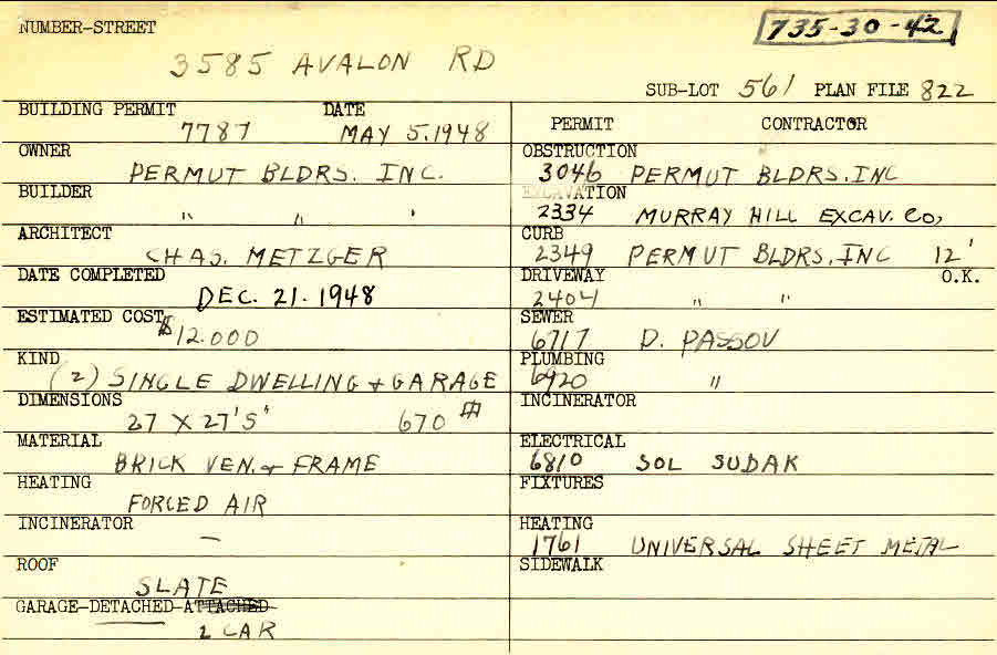 3585 Avalon Road Shaker Heights, OH 44120 PARCEL ID: 735-30-042 Building Permit Date: 05-05-1948 Plan File Number: 822 all scanned Microfilm Roll: Roll011 Neighborhood: Lomond Owner: Permut Builders Inc. Builder: Permut Builders Inc. Architect: Metzger, Charles A. Estimated Cost: 12000 Date Completed: 12-21-1948 Kind: Single Dwelling and Garage (2) Material: Brick Veneer and Frame Heating: Forced Air Roof: Slate Garage: detached 2 car |