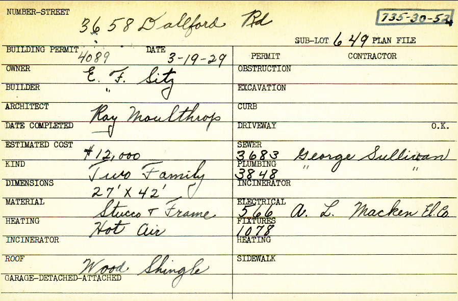 3658 Daleford Road Shaker Heights, OH 44120 PARCEL ID: 735-30-052 Building Permit Date: 03-19-1929 Plan File Number: 0 Neighborhood: Lomond Owner: Sitz, E. F. Builder: Sitz, E. F. Architect: Moulthrop, Ray Estimated Cost: 12000 Kind: Duplex or Two-Family Material: Stucco and Frame Heating: Hot Air Roof: Wood Shingle |