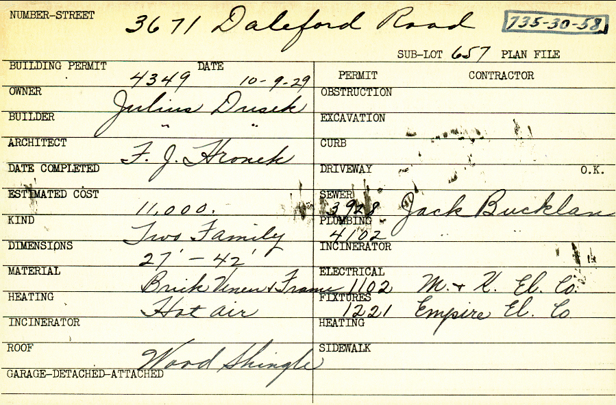 3671 Daleford Road Shaker Heights, OH 44120 PARCEL ID: 735-30-058 Building Permit Date: 10-09-1929 Plan File Number: 0 Neighborhood: Lomond Owner: Dresek, Julius Builder: Dresek, Julius Architect: Hronek, F. J Estimated Cost: 11000 Kind: Duplex or Two-Family Material: Brick Veneer and Frame Heating: Hot Air Roof: Wood Shingle |