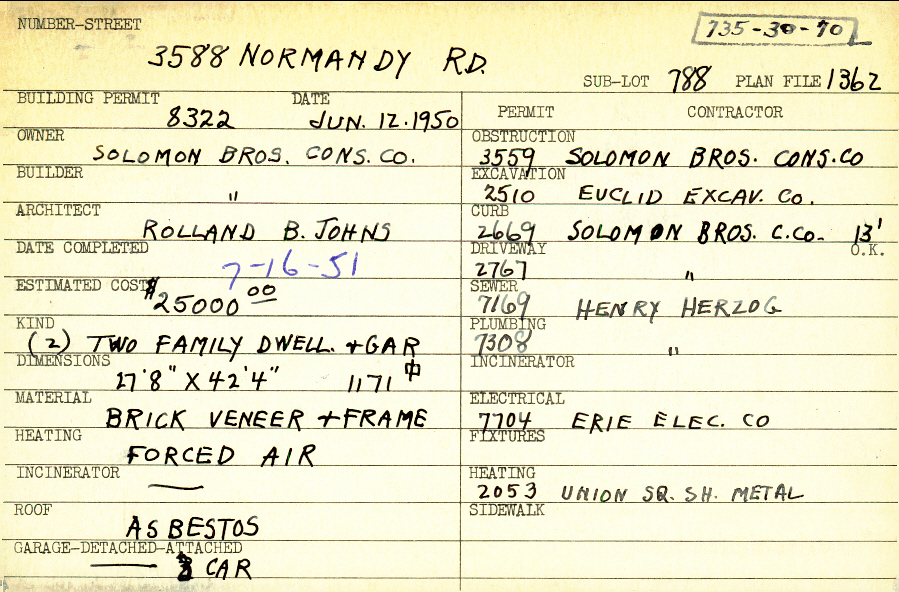 3588 Normandy Road Shaker Heights, OH 44120 PARCEL ID: 735-30-070 Building Permit Date: 06-12-1950 Plan File Number: 1362 scanned, 10016 Microfilm Roll: Roll016, Roll#105 Neighborhood: Lomond Owner: Solomon Brothers Construction Company Builder: Solomon Brothers Construction Company Architect: Johns, Rolland B. Estimated Cost: 25000 Date Completed: 07-16-1951 Kind: Duplex or Two-Family and Garage Material: Brick Veneer and Frame Heating: Forced Air Roof: Asbestos Garage: detached 3 car |