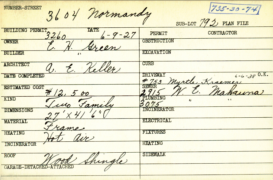 3604 Normandy Road Shaker Heights, OH 44120 PARCEL ID: 735-30-074 Building Permit Date: 06-09-1927 Plan File Number: 0 Neighborhood: Lomond Owner: Green, E. H. Builder: Green, E. H. Architect: Keller, Arthur Emil Estimated Cost: 12500 Kind: Duplex or Two-Family Material: Frame Heating: Hot Air Roof: Wood Shingle |