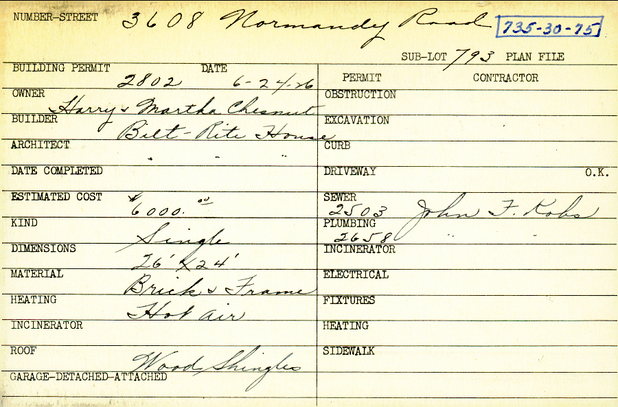 3608 Normandy Road Shaker Heights, OH 44120 PARCEL ID: 735-30-075 Building Permit Date: 06-24-1926 Plan File Number: 0 Neighborhood: Lomond Owner: Chesnut, Harry and Martha Builder: Bilt-Rite House Architect: Bilt-Rite House Estimated Cost: 6000 Kind: Single, Single Residence or Dwelling Material: Brick and Frame Heating: Hot Air Roof: Wood Shingle Card Available: yes |