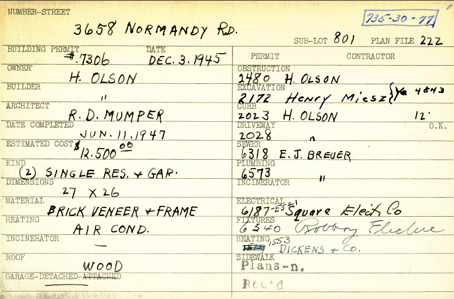 3658 Normandy Road Shaker Heights, OH 44120 PARCEL ID: 735-30-077 Building Permit Date: 12-03-1945 Plan File Number: 222 scanned, 596 all scanned Microfilm Roll: Roll002, Roll007 Neighborhood: Lomond Owner: Olson, H. Builder: Olson, H. Architect: Mumper, R. D. Estimated Cost: 12500 Date Completed: 06-11-1947 Kind: Single Dwelling and Garage (2) Material: Brick Veneer and Frame Heating: Air Conditioned Roof: Wood Garage: detached |
