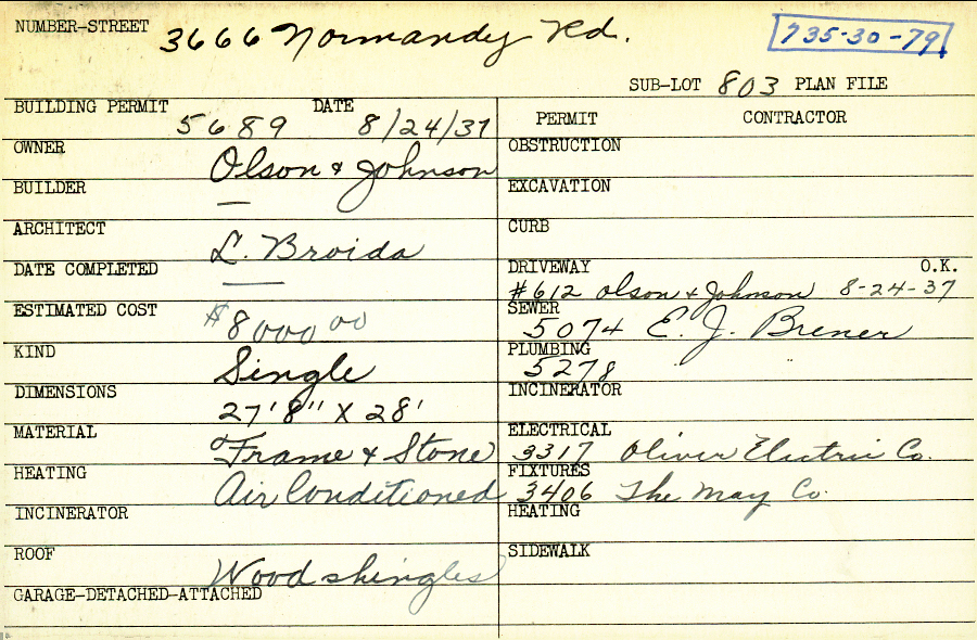 3666 Normandy Road Shaker Heights, OH 44120 PARCEL ID: 735-30-079 Building Permit Date: 08-24-1937 Plan File Number: 0 Neighborhood: Lomond Owner: Olson and Johnson Architect: Broida, L. Estimated Cost: 8000 Kind: Single, Single Residence or Dwelling Material: Frame and Stone Heating: Air Conditioned Roof: Wood Shingle Card Available: yes |