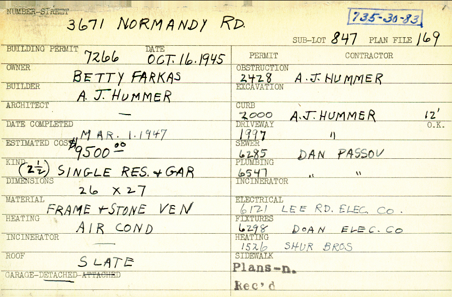 3671 Normandy Road Shaker Heights, OH 44120 PARCEL ID: 735-30-083 Building Permit Date: 10-16-1945 Plan File Number: 169 scanned, 3358 Microfilm Roll: Roll002, Roll#48 Neighborhood: Lomond Owner: Farkas, Betty Builder: Hummer, A. J. Estimated Cost: 9500 Date Completed: 03-01-1947 Kind: Single 2-1/2 Material: Frame and Stone Veneer Heating: Air Conditioned Roof: Slate Garage: detached |