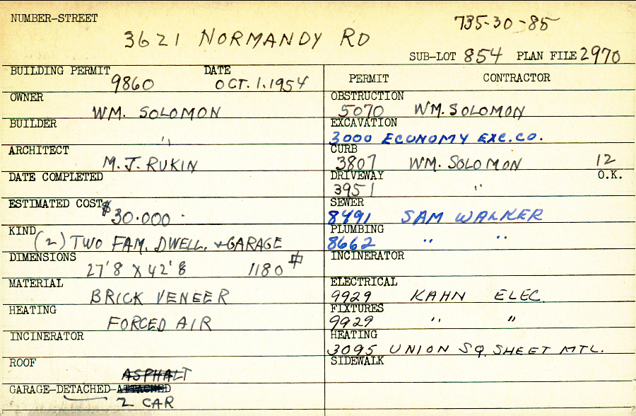 3621 Normandy Road Shaker Heights, OH 44120 PARCEL ID: 735-30-085 Building Permit Date: 10-01-1954 Plan File Number: 2970 Microfilm Roll: Roll#42 Neighborhood: Lomond Owner: Solomon, William Builder: Solomon, William Architect: Rukin, M. J. Estimated Cost: 30000 Kind: Duplex or Two-Family and Garage Material: Brick Veneer Heating: Forced Air Roof: Asphalt Garage: detached 2 car |