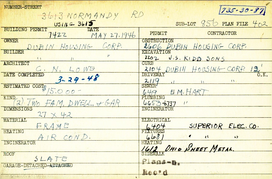 3615 Normandy Road Shaker Heights, OH 44120 PARCEL ID: 735-30-087 Building Permit Date: 05-27-1946 Plan File Number: 402 all scanned Microfilm Roll: Roll004 Neighborhood: Lomond Owner: Dubin Housing Corporation Builder: Dubin Housing Corporation Architect: Lowe, C. N. Estimated Cost: 15000 Date Completed: 03-29-1948 Kind: Duplex or Two-Family and Garage Material: Frame Heating: Air Conditioned Roof: Slate Garage: detached |