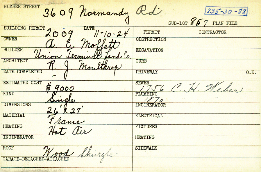 3609 Normandy Road Shaker Heights, OH 44120 PARCEL ID: 735-30-088 Building Permit Date: 11-10-1924 Plan File Number: 7841 Microfilm Roll: Roll#94 Neighborhood: Lomond Owner: Moffett, A. E. Builder: Union Terminal Land Company Architect: Moulthrop, R. J. Estimated Cost: 9000 Kind: Single, Single Residence or Dwelling Material: Frame Heating: Hot Air Roof: Wood Shingle |