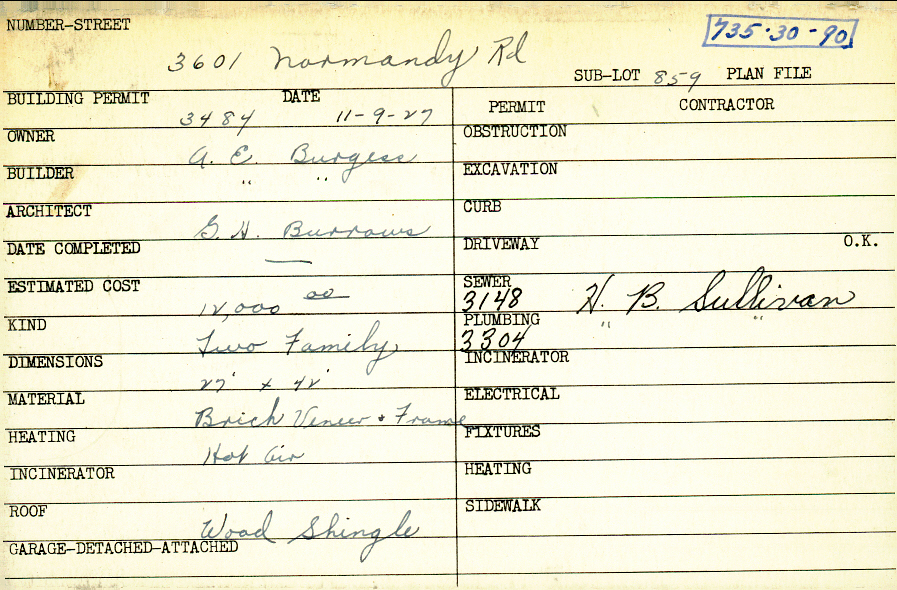 3601 Normandy Road Shaker Heights, OH 44120 PARCEL ID: 735-30-090 Building Permit Date: 11-09-1927 Plan File Number: 0 Neighborhood: Lomond Owner: Burgess, A. E. Builder: Burgess, A. E. Architect: Burrows, G. H. Estimated Cost: 12000 Kind: Duplex or Two-Family Material: Brick Veneer and Frame Heating: Hot Air Roof: Wood Shingle |