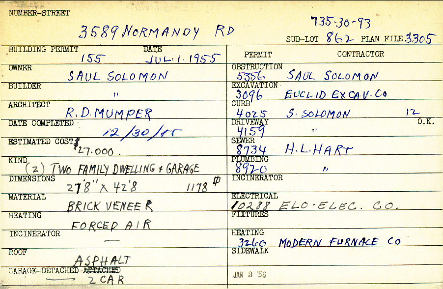 3589 Normandy Road Shaker Heights, OH 44120 PARCEL ID: 735-30-093 Building Permit Date: 07-01-1955 Plan File Number: 3305, 5417 Microfilm Roll: Roll#48, Roll#73 Neighborhood: Lomond Owner: Solomon, Saul Builder: Solomon, Saul Architect: Mumper, R. D. Estimated Cost: 27000 Date Completed: 12-30-1955 Kind: Duplex or Two-Family and Garage Material: Brick Veneer Heating: Forced Air Roof: Asphalt Garage: detached 2 car |