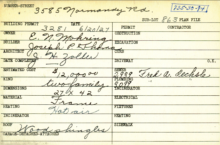 3585 Normandy Road Shaker Heights, OH 44120 PARCEL ID: 735-30-094 Building Permit Date: 06-20-1927 Plan File Number: 93-20* Microfilm Roll: NewRoll#16 Neighborhood: Lomond Owner: Mohring, E. N. Builder: Thoma, Joseph P. Architect: Zoller, J. H. Estimated Cost: 12000 Kind: Duplex or Two-Family Material: Frame Heating: Hot Air Roof: Wood Shingle |