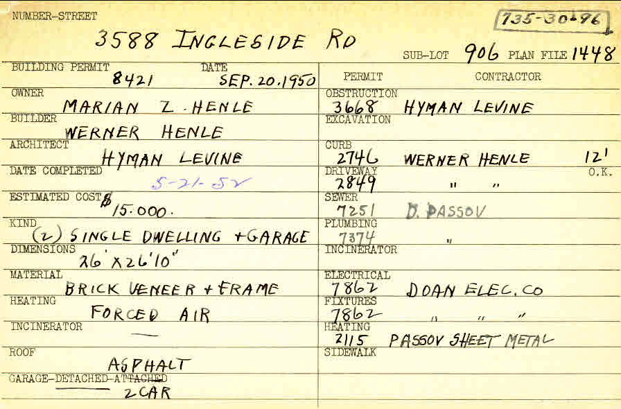 3588 Ingleside Road Shaker Heights, OH 44122 PARCEL ID: 735-30-096 Building Permit Date: 09-20-1950 Plan File Number: 1448 scanned, 6171, 6712, 7538 Microfilm Roll: Roll016, Roll#83, Roll#88, Roll#93 Neighborhood: Lomond Owner: Henle, Marian Z. Builder: Henle, Werner Architect: Levine, Hyman Estimated Cost: 15000 Date Completed: 05-21-1952 Kind: Single Dwelling and Garage (2) Material: Brick Veneer and Frame Heating: Forced Air Roof: Asphalt Garage: detached 2 car |