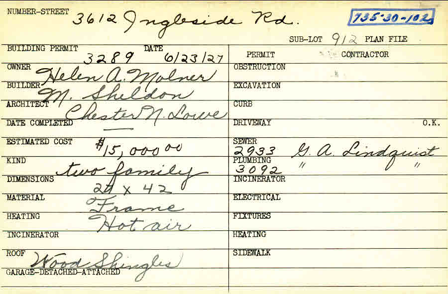 3612 Ingleside Road Shaker Heights, OH 44122 PARCEL ID: 735-30-102 Building Permit Date: 06-23-1927 Plan File Number: 12352 Microfilm Roll: NewRoll#17 Neighborhood: Lomond Owner: Molner, Helen A. Builder: Sheldon, M. Architect: Lowe, Chester N. Estimated Cost: 15000 Kind: Duplex or Two-Family Material: Frame Heating: Hot Air Roof: Wood Shingle |