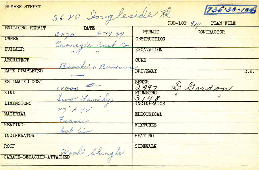 3620 Ingleside Road Shaker Heights, OH 44122 PARCEL ID: 735-30-104 Building Permit Date: 06-14-1927 Plan File Number: 0 Neighborhood: Lomond Owner: Carnegie Construction Company Builder: Carnegie Construction Company Architect: Brooke and Burrows Estimated Cost: 12000 Kind: Duplex or Two-Family Material: Frame Heating: Hot Air Roof: Wood Shingle Card Available: yes |