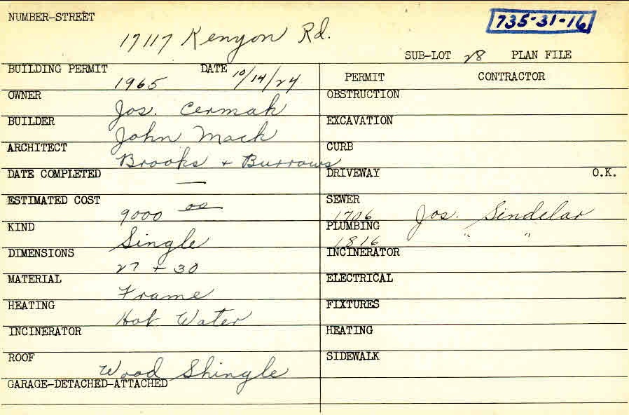 17117 Kenyon Road Shaker Heights, OH 44120 PARCEL ID: 735-31-016 Building Permit Date: 10-14-1924 Plan File Number: 6113 Microfilm Roll: Roll#83 Neighborhood: Lomond Owner: Cermak, Joseph Builder: Mack, John Architect: Brooke and Burrows Estimated Cost: 9000 Kind: Single, Single Residence or Dwelling Material: Frame Heating: Hot Water Roof: Wood Shingle |