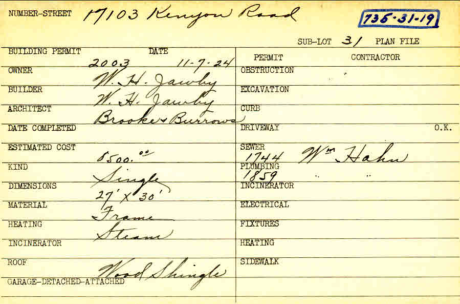 17103 Kenyon Road Shaker Heights, OH 44120 PARCEL ID: 735-31-019 Building Permit Date: 11-07-1924 Plan File Number: 0 Neighborhood: Lomond Owner: Jawby, W. H. Builder: Jawby, W. H. Architect: Brooke and Burrows Estimated Cost: 8500 Kind: Single, Single Residence or Dwelling Material: Frame Heating: Steam Roof: Wood Shingle Card Available: yes |